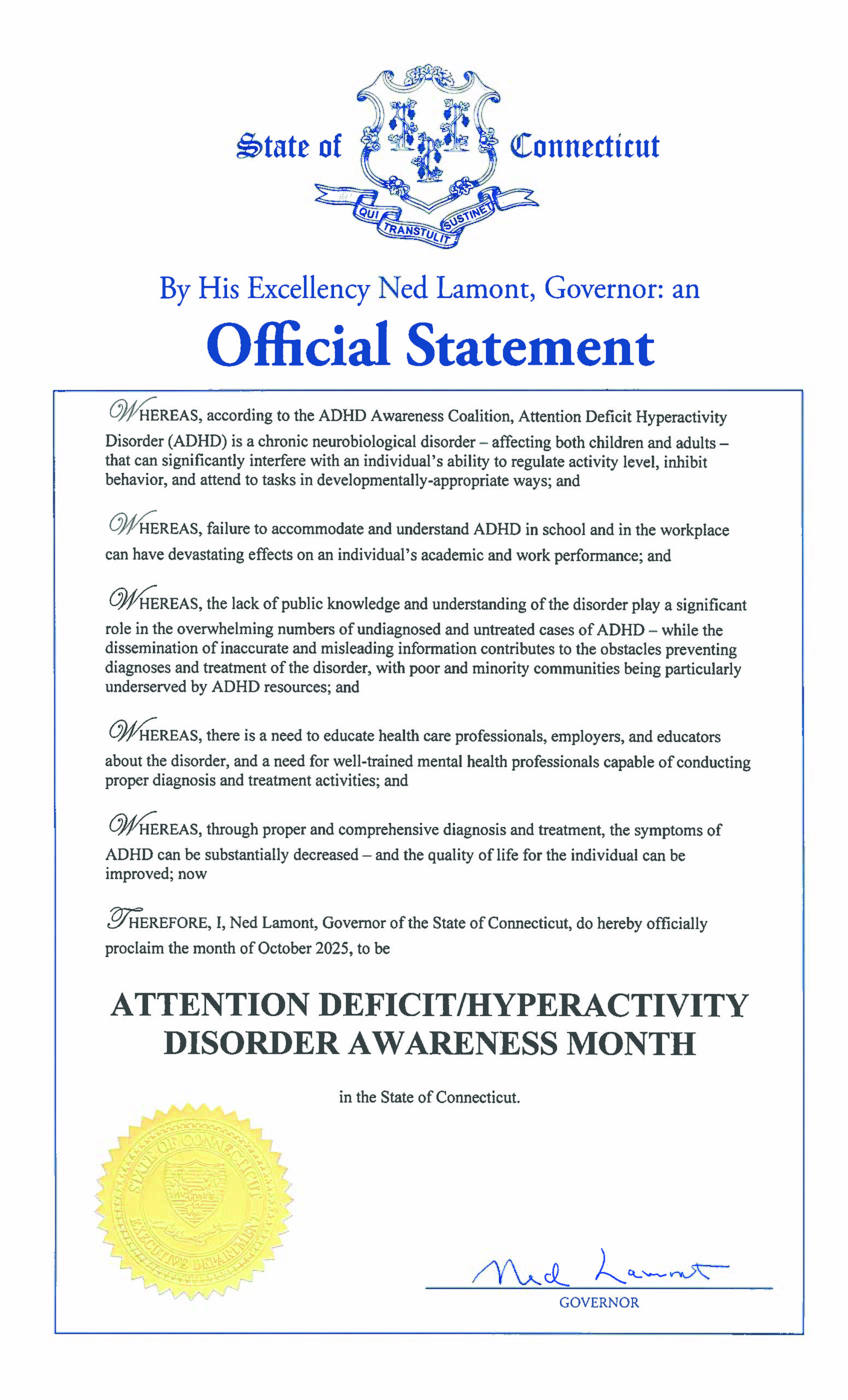 WHEREAS, according to the ADHD Awareness Coalition, Attention Deficit Hyperactivity Disorder (ADHD) is a chronic neurobiological disorder — affecting both children and adults — that can significantly interfere with an individual’s ability to regulate activity level, inhibit behavior, and attend to tasks in developmentally-appropriate ways; and